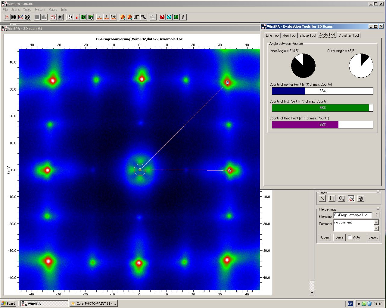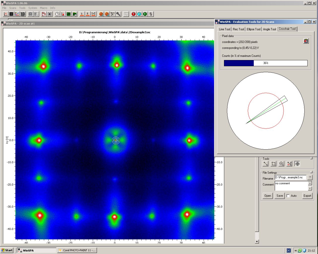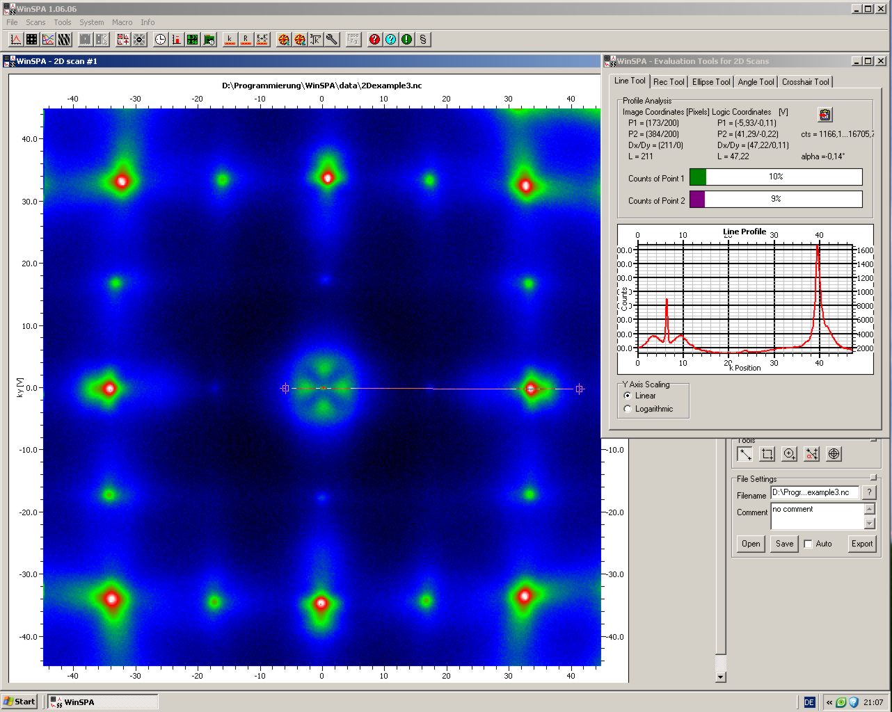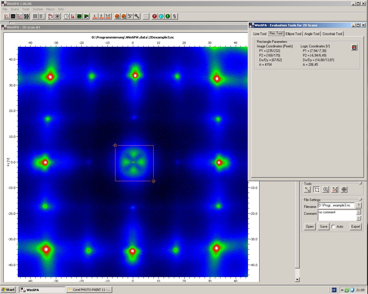 - Measure the center of intensity of the (00) spot with the ellipse tool.